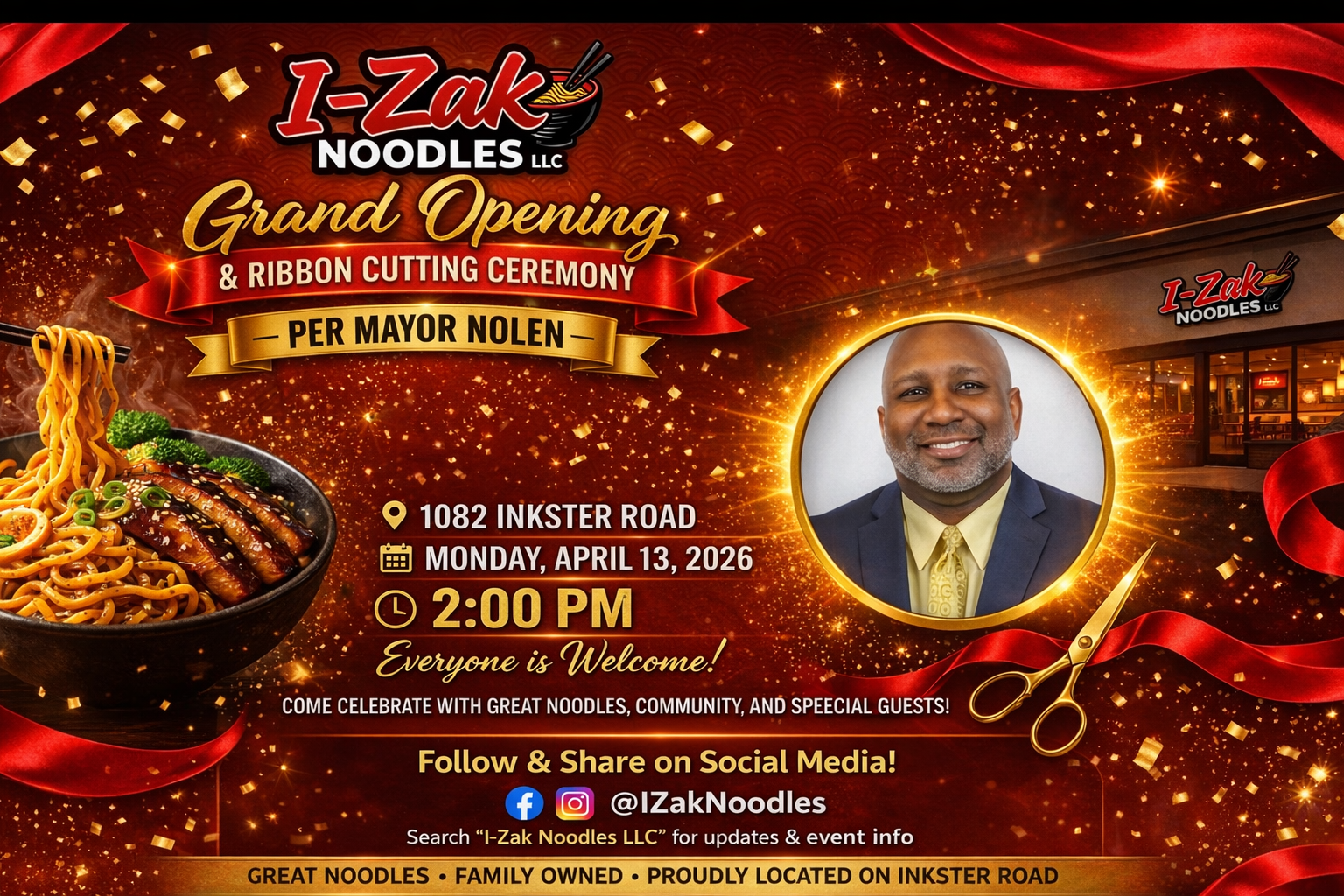 Join us for the grand opening and ribbon-cutting ceremony of I-Zak Noodles on April 13, 2026, at 2:00 PM. Celebrate a new local business in Inkster!